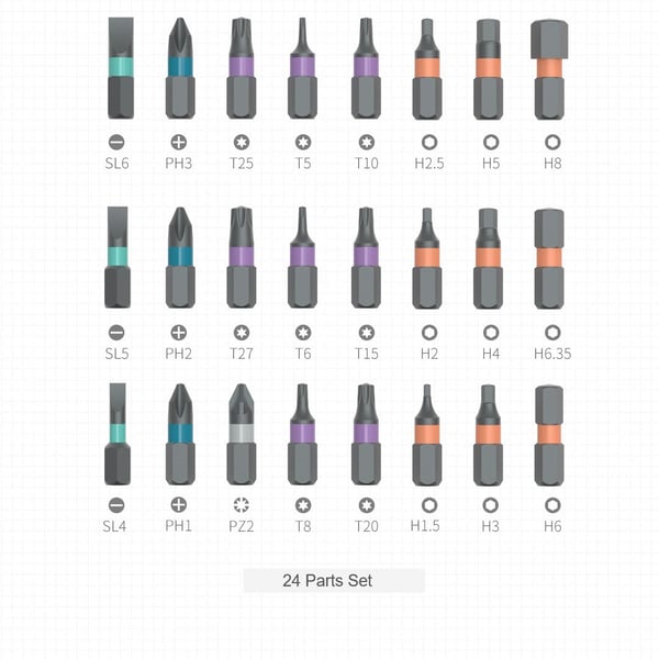 Uanset om du reparerer elektronik, cykler eller møbler, sørger dette 24-i-1 multiværktøjssæt for, at du altid har det rette værktøj. Sættet indeholder 24 bits i industrielt S2 krom-molybdænstål, farvekodet for nem genkendelse. Udskiftelige håndtag gør værktøjet alsidigt og velegnet til arbejde i trange og ujævne områder, både inde og ude.