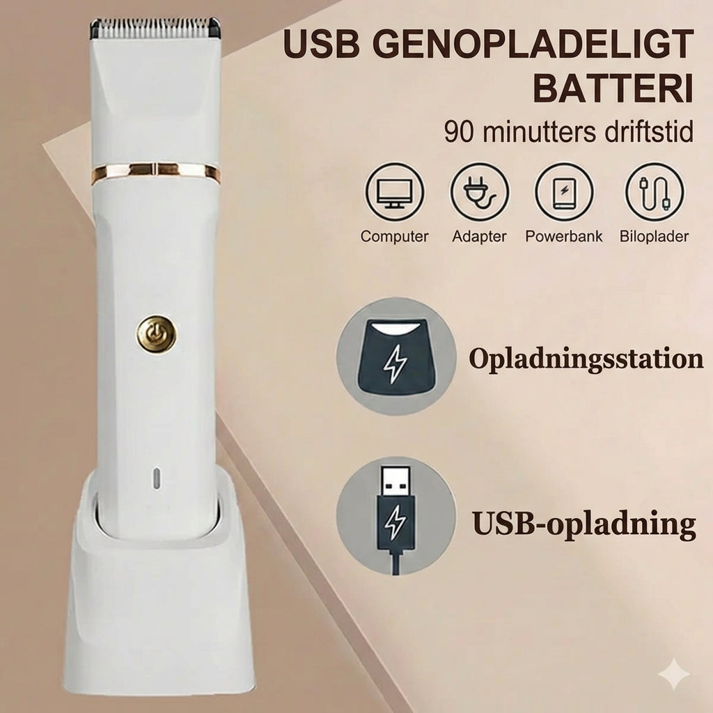 Nyd bekvemmelighed og diskretion. Den kraftige, men støjsvage motor er ideel til hurtig pleje om morgenen. Det vandtætte skærehoved kan nemt skylles under vand, og USB-opladning gør det let at oplade både hjemme og på farten.