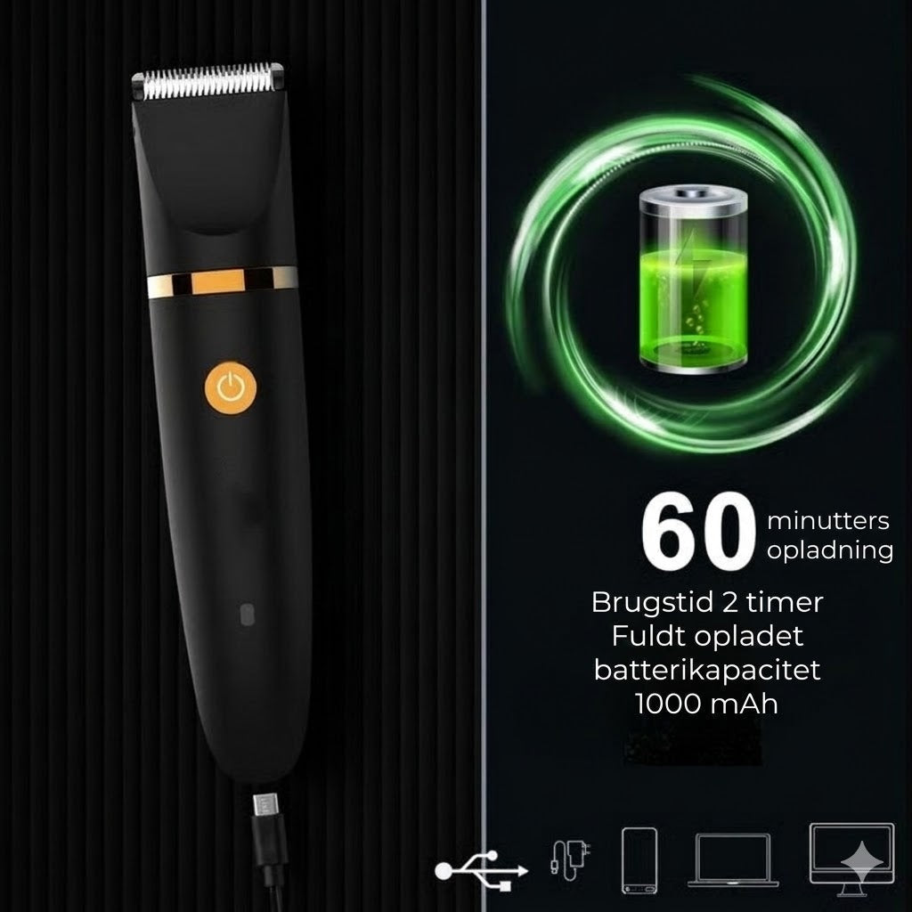 Fuldt vandtæt til både tør og våd brug. Med en høj IPX7-vandbeskyttelse kan trimmeren bruges både tør og under bruseren. Det trådløse design giver større bevægelsesfrihed. Rengøringen er enkel – skyl blot enheden og skærehovedet under vand.