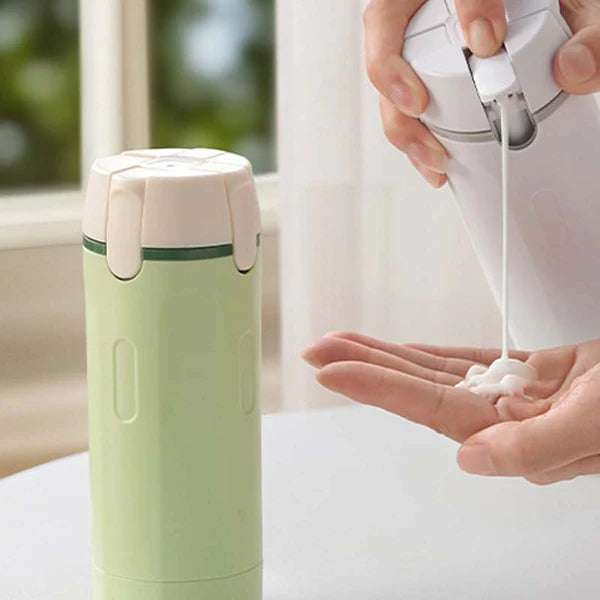 Med et enkelt tryk kan du nemt dosere shampoo, lotion, ansigtsrens eller toner. De fire indvendige beholdere fyldes hurtigt – skru låget af og hæld væsken i. Hver beholder har tydelig måleskala (5–30 ml) samt praktiske etiketter, så du altid har overblik.