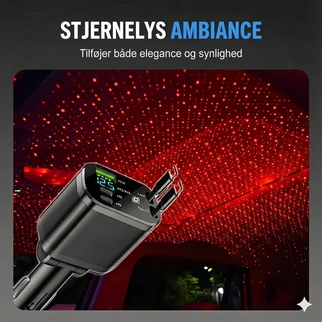 Den indbyggede stemningsbelysning projicerer en blød stjernehimmeleffekt, som løfter din køreoplevelse og tilfører kabinen et strejf af elegance og moderne stil. Samtidig forbedrer lyset synligheden om natten. Opladeren har et kompakt og let design, der passer perfekt i bilens stik uden at være i vejen under kørslen. Den robuste konstruktion er skabt til daglig brug og sikrer langvarig og pålidelig ydeevne.