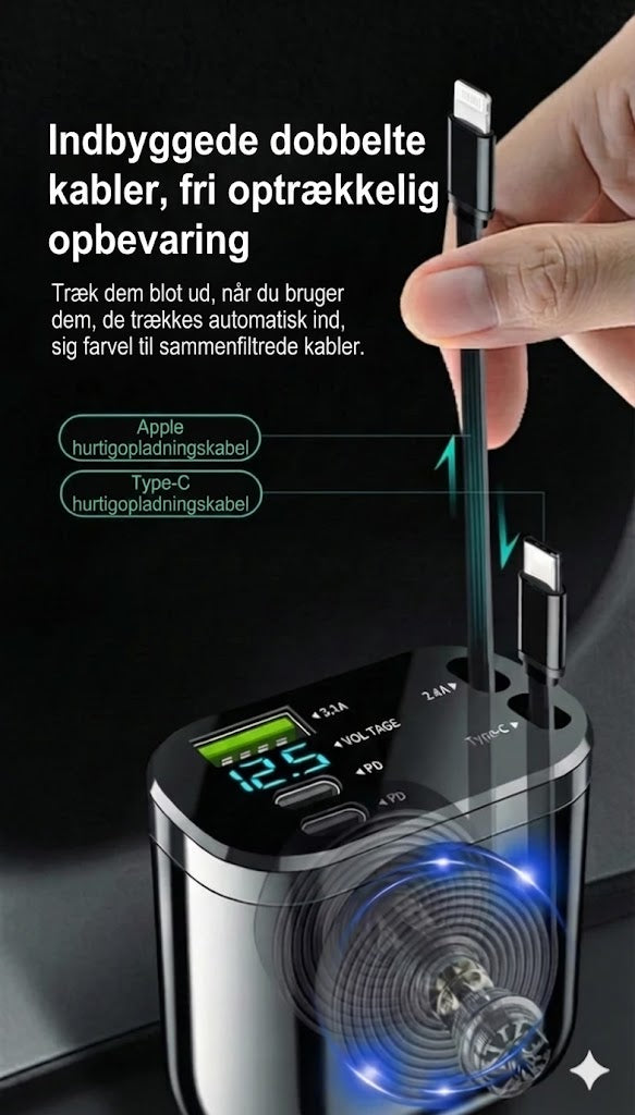 Denne innovative biloplader er udstyret med to udtrækkelige Type-C-kabler, som hjælper dig med at holde bilen pæn og ryddelig. Det gennemtænkte design eliminerer effektivt kabelrod – træk blot kablet ud, når du har brug for det, og lad det automatisk rulle tilbage efter brug. Takket være avanceret hurtigopladningsteknologi bliver dine enheder opladet på kort tid, hvilket reducerer ventetid markant for dig, der ofte er på farten eller på forretningsrejse.