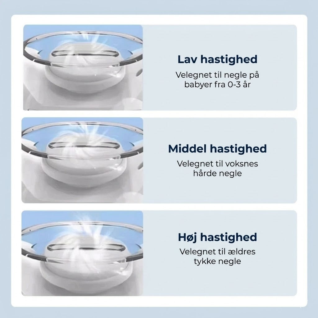 Tre justerbare hastigheder til forskellige negletyper. Neglefilen har tre hastighedsindstillinger, som kan tilpasses forskellige negletykkelser og behov. Uanset om det er børns bløde negle eller voksnes hårdere negle, hjælper dette praktiske værktøj med at skabe glatte og velplejede neglekanter.