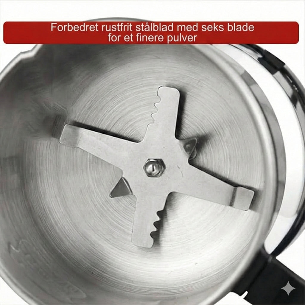 Kraftig motor: 300 W, gør det nemt at male hårde kaffebønner, nødder og krydderier.