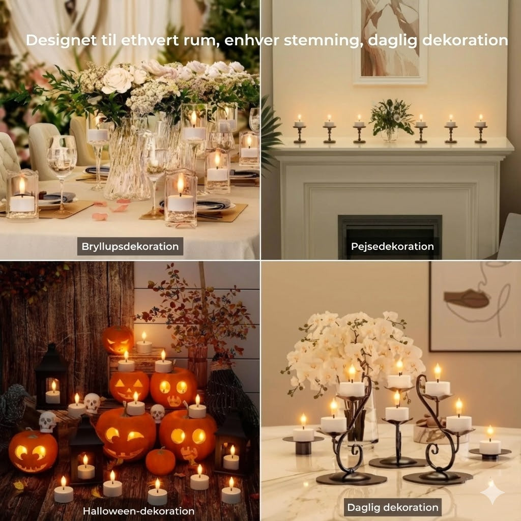 Disse LED-lysholdere i te-lys-format udsender et varmt og naturtro flimrende lys, der næsten er umuligt at skelne fra ægte stearinlys. Takket være det unikke 3D-lysflamme-design får du en autentisk stemning – helt uden røg, smeltet voks eller brandfare. Et sikkert valg til hjem med børn, kæledyr eller mange tekstiler, hvor ægte lys ikke er praktiske.