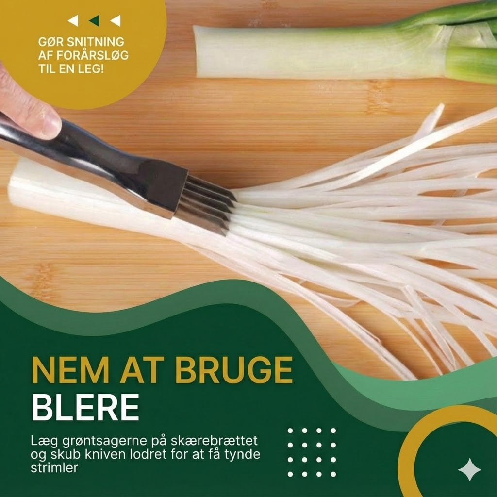 Denne praktiske multiskærer er udstyret med 6 ultraskarpe blade, som glider let gennem grøntsager og skærer i begge retninger for maksimal effektivitet. Du kan hurtigt og ensartet snitte store mængder forårsløg i fine strimler – perfekt til både hverdagsmadlavning og hurtige måltider.