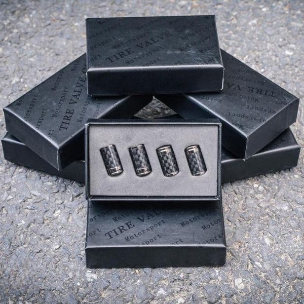 Luksus ventilhættesæt i kulfiberstil – Kulfiberlook – Universel til bil, motorcykel og cykel – Sporty hjulbeskyttelse – [4 stk.]