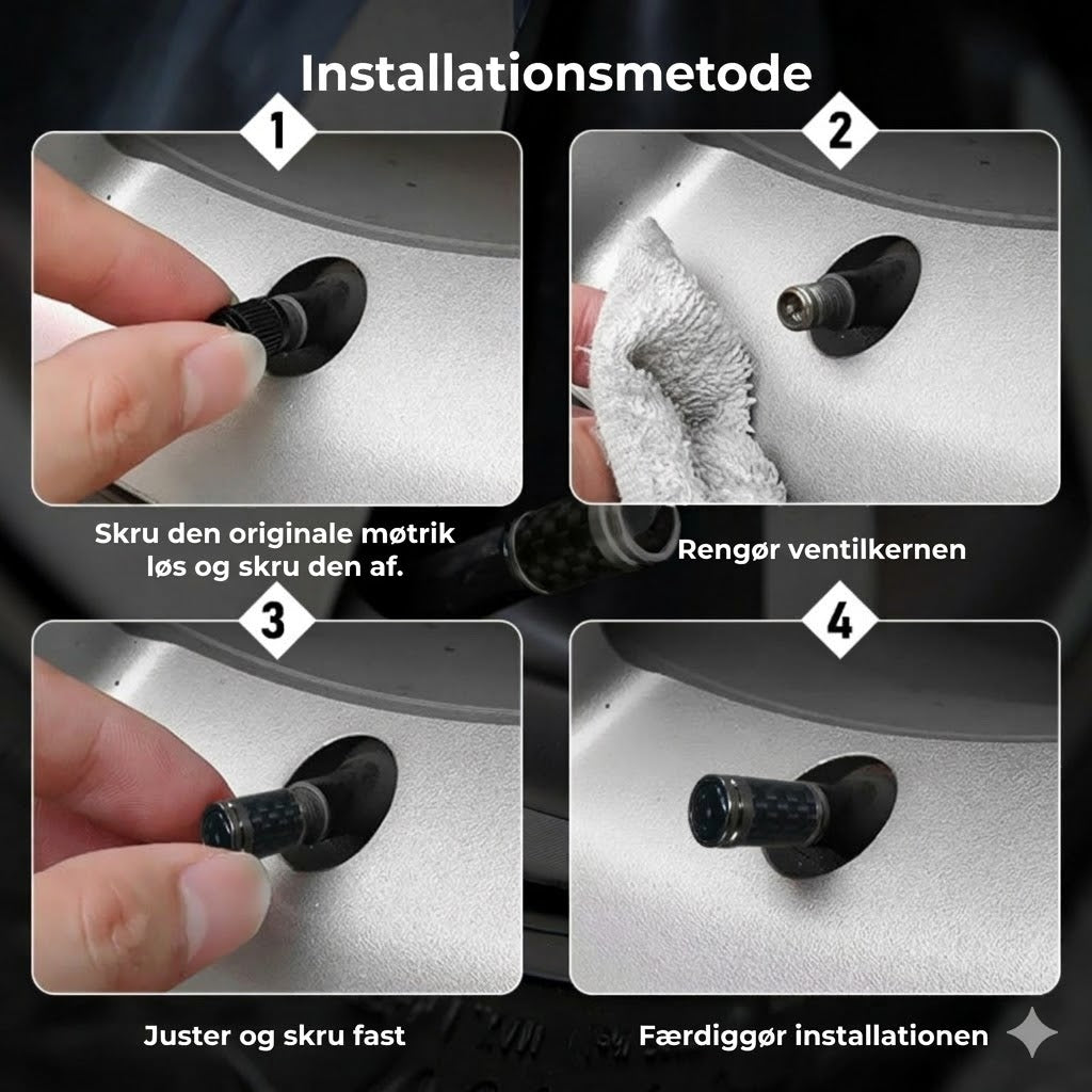 Hurtig installation uden værktøj. Monteringen tager kun få sekunder: fjern den gamle plastikhætte, rengør ventilen og skru den nye ventilhætte på i hånden. Takket være det glatte indvendige gevind er der ikke behov for værktøj. Hætterne kan let fjernes, når du vil kontrollere dæktrykket eller pumpe dækket.
